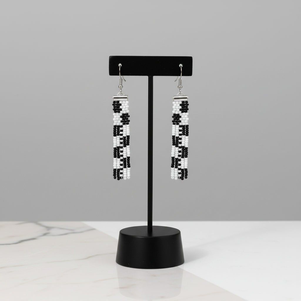 Hand-beaded in striking black and white, the Addie Earrings feature a 3-inch cascade of geometric fringe that moves with quiet drama. Each strand is meticulously crafted to evoke balance, rhythm, and modern elegance. Suspended from sleek metal hooks, Addie blends artisanal craftsmanship with runway-worthy style.