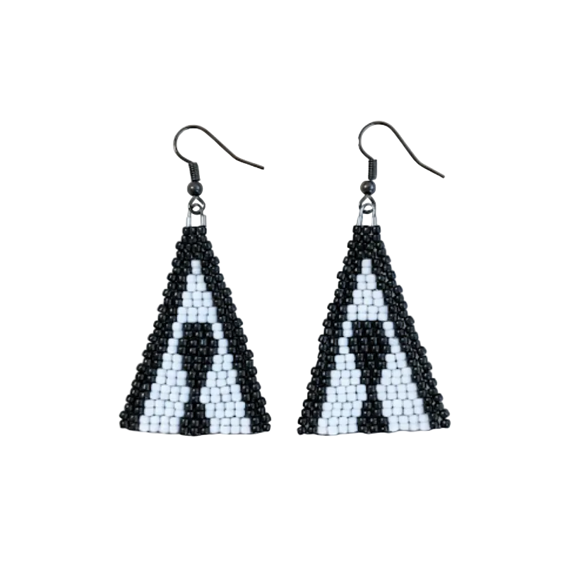 Step into your calling. The Access Earrings are handcrafted with premium beads in a striking geometric pattern of black and white—designed to evoke the symbolism of divine entry, spiritual authority, and timeless elegance. The nested triangle motif reflects strength and alignment, while the monochrome palette adds graphic sophistication.